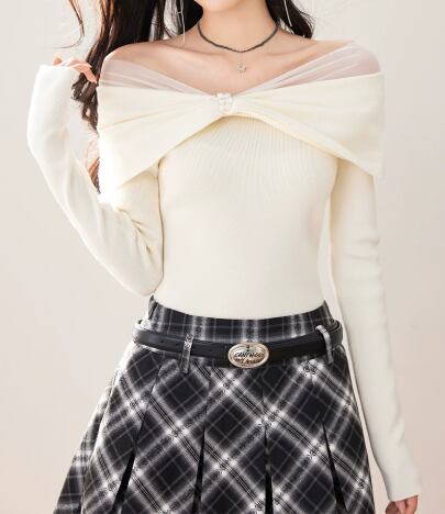 オフショルダー メッシュパールパッチワーク セーター 1032